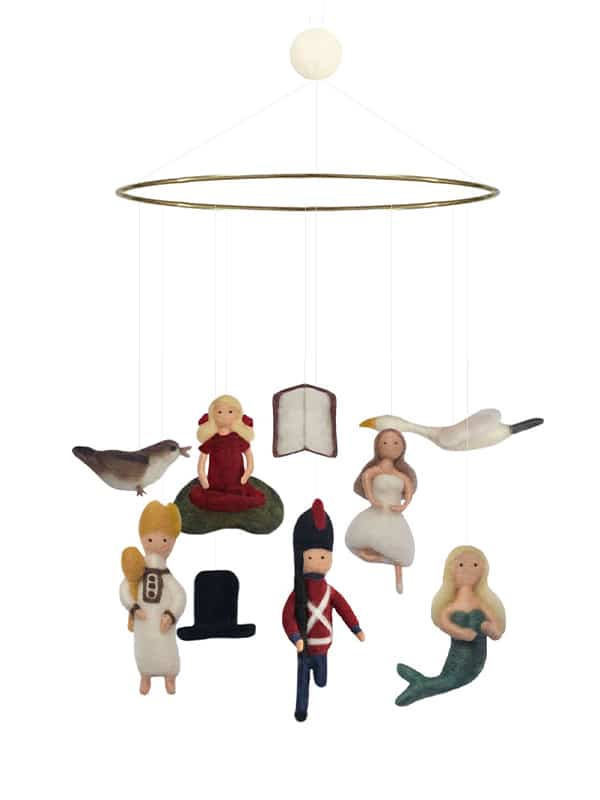 Gamcha Mobil H.C. Andersen är en handgjord ullmobil inspirerad av sagornas magiska värld. Mobilen består av vackra figurer från H.C. Andersens sagor som svävar mjukt runt en guldfärgad metallställning och skapar en drömsk känsla i barnrummet.